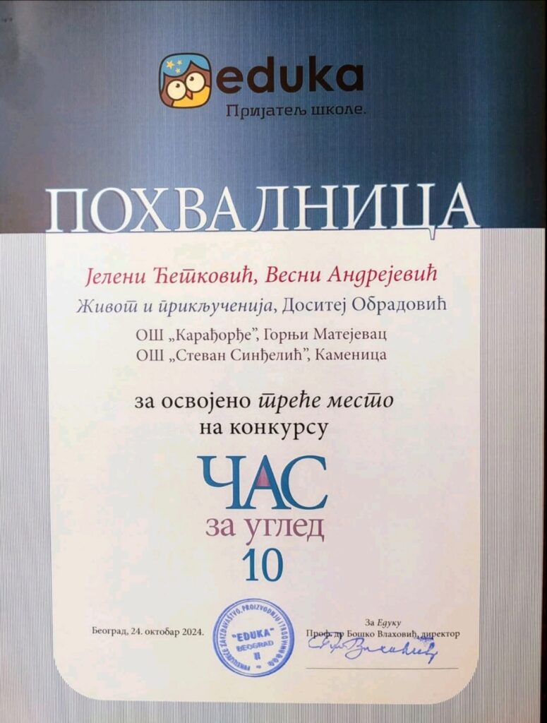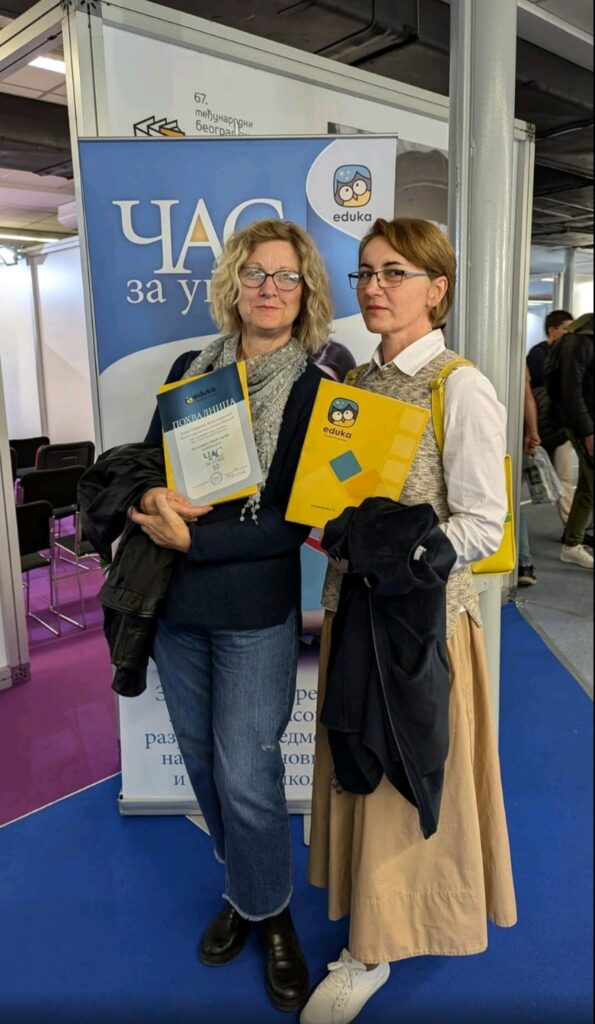 На 67. Међународном сајму књига, одржаном од 19. до 27. октобра 2024. године, наставница српског језика наше школе, Весна Андрејевић, добила је похвалницу за освојено треће место на конкурсу “Час за углед 10”. Овај престижни догађај окупио је бројне љубитеље књига, издаваче и едукативне раднике, а наставница Весна је овом приликом награђена за посвећеност и иновативност у настави српског језика и књижевности.